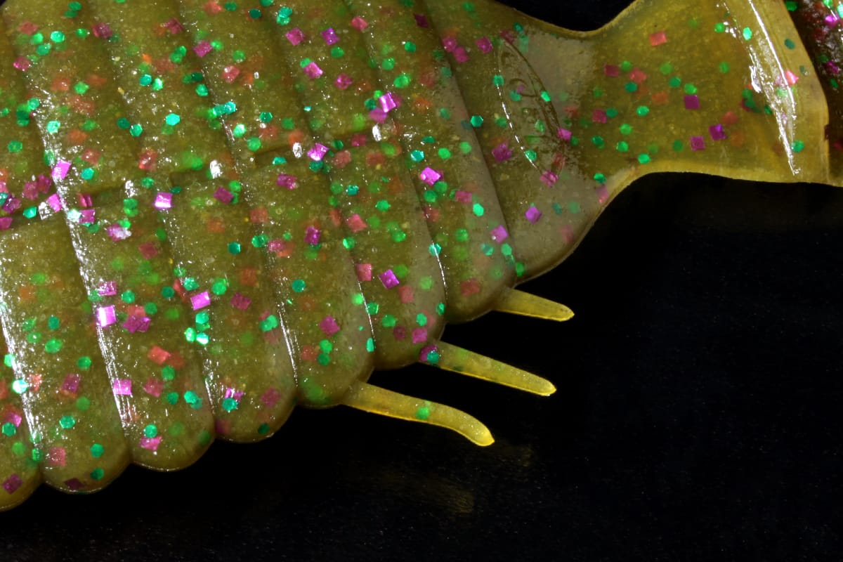 Son corps aplati génère une résistance hydrodynamique contrôlée, à l’origine d’un spiral fall unique en chute libre ou en montage texan. Cette action de descente, difficile à imiter avec des leurres classiques, déclenche l’attaque de poissons devenus méfiants face aux présentations trop linéaires. La queue en accordéon capte la moindre veine d’eau et s’anime même à très faible vitesse, tandis que les bras latéraux produisent de fines micro-vibrations rappelant les battements nerveux d’un bluegill en activité.