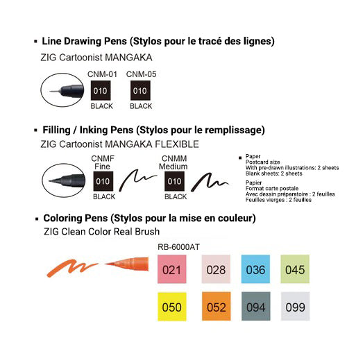 Le coffret comprend 4 stylos à encre pigmentée à base d’eau pour le dessin des lignes et le remplissage, offrant précision, contrôle et résistance à l’eau après séchage. Il inclut également 8 pinceaux-feutres à encre colorante de la gamme Clean Color Real Brush, idéals pour apporter douceur, nuances et harmonie chromatique aux compositions.
