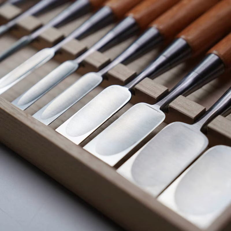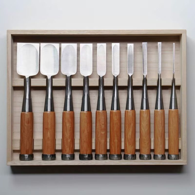 Ce jeu de 10 ciseaux japonais Oire Nomi est fabriqué par Sukemaru, un atelier japonais reconnu pour ses outils robustes et fonctionnels destinés aux artisans du bois.