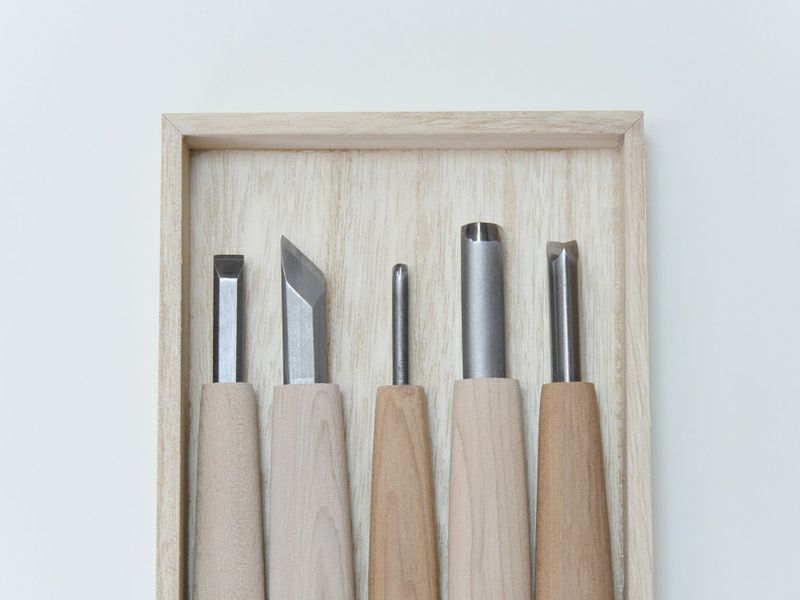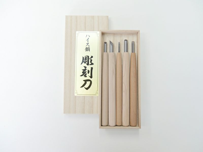 Ce coffret comprend cinq formes essentielles : le hirahō (ciseau plat), le marutō (ciseau gouge), le sankakutō (ciseau triangulaire) et le intō (couteau de sculpture). Ce sont les cinq outils indispensables à tout sculpteur, qu’il s’agisse de débutants souhaitant acquérir un premier set de qualité ou de professionnels recherchant un tranchant durable.